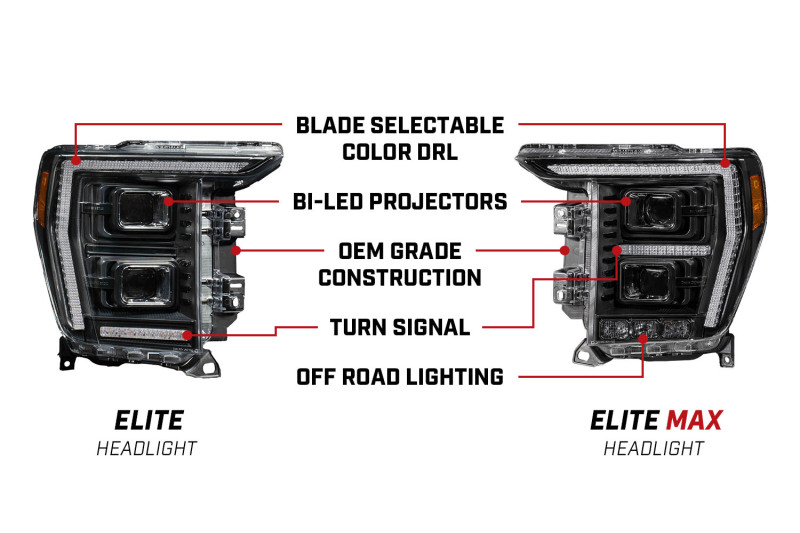 Features Dual Bi-LED projectors for maximum output and intensity Selectable color, premium Blade DRL Modern welcome sequence and sequential turn signal Optional adaptive Low Beam Assist and High Beam Boost Integrated off-road lighting and show mode (Elite Max) Engineered and Assembled in USA - 8 Year Warranty Overview Introducing Elite Series LED Headlights compatible with 2021-2023 Ford F-150 w/ Non-Projector Headlamps from Diode Dynamics! These headlights were designed for maximum performance, and they are the only aftermarket headlights for the F-150 that are 100% engineered and assembled in the USA! With OEM-grade quality, the Elite Series headlights will add a sequential turn signal, welcome sequence, a brighter blade DRL with selectable color, and optional offroad lighting and show mode. Plus, you’ll get upgraded headlight performance and output, backed by an 8-year warranty. Maximum Light Output.The Elite Series LED Headlights provide full LED illumination for both low beam and high beam function, with the modern, rectangular bi-LED projector. This unit provides higher intensity than both the OEM halogen and LED options, shining light far down the road ahead. The beam pattern has a sharp cutoff, with excellent center intensity and strong width, for a fantastic nighttime driving experience. The same projector is installed on both the Elite and Elite Max models. Selectable DRL - On the Fly. These headlights feature a selectable DRL, to customize the look of your F-150. With up to four distinct DRL modes, you can choose white and amber colors, and enable or disable the extra DRL bars (if equipped). No need to pop the hood. Our patent-pending technology allows you to program your headlights from inside the vehicle, using existing controls.
