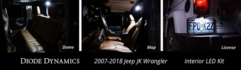 Features Includes all the LEDs you need to replace the interior incandescent bulbs Increased output with LED appearance Plug-and-play, simple installation This listing includes our Stage 2 Cool White Interior lighting pack. Overview Upgrade. This Interior LED Bulb Pack is compatible with the Jeep JK Wrangler and gives your vehicle a more modern appearance. this pack includes all the LEDs you need to replace the factory map, dome, and license plate incandescent bulbs. Brightness. This Stage 2 option is a good choice if you are looking for a simple change of color, and, the highest increase in light output from your factory bulbs. All Diode Dynamics LED lighting is rated with accurate, measured lumen figures, not calculations or guesses. We test the true output in-house, and provide you the real numbers to compare. Reliability. Unlike other bulbs on the market, Diode Dynamics LEDs are built with constant-current inductive circuitry, along with transient suppression. While more expensive than simple bulbs, this allows Diode Dynamics LEDs to last for years, with no flickering or failure. What's Included Two (2) 194 HP5 Map Cool White Light Bulbs One (1) 41mm HP6 Dome Cool White Light Bulb One (1) 194 HP5 License Plate Cool White Light Bulb Installation Guide