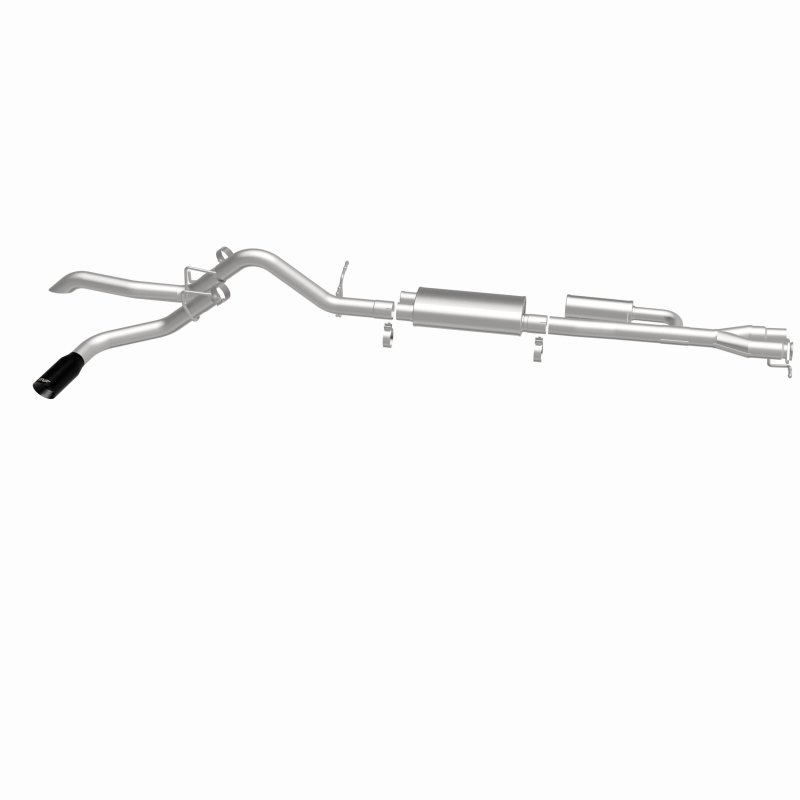 The MagnaFlow Ford Ranger Overland Series Cat-Back Performance Exhaust System #19663 is engineered for off-road function and built to explore further. This exhaust system is designed for the 2024-2025 Ford Ranger equipped with the V6 2.7L engine option. The high clearance exhaust design of this kit is intended to keep your truck clear of any challenging terrain or obstacles you may come across. #19663 3” diameter mandrel bent main piping passes through a No Drone Technology (NDT) chamber and an all-new specifically tuned performance oval muffler before exiting in a high-clearance single passenger side rear exit style. Also included is a clamp-on tailpipe sub-assembly with a single passenger side rear exit and black chrome 4” tip giving you a finished look when cruising around town. MagnaFlow NDT utilizes passive quarter-wave noise cancellation to minimize the unwanted droning noises that can otherwise occur at highway cruising speeds. Exhaust kit #19663 utilizes a direct-fit, easy to install design that replaces your OEM exhaust system from the catalytic converter on back. This Ford Ranger cat-back performance exhaust system is made of durable, corrosion resistant stainless steel and produced using advanced CNC precision robotic manufacturing techniques, all backed by MagnaFlow’s limited lifetime warranty.