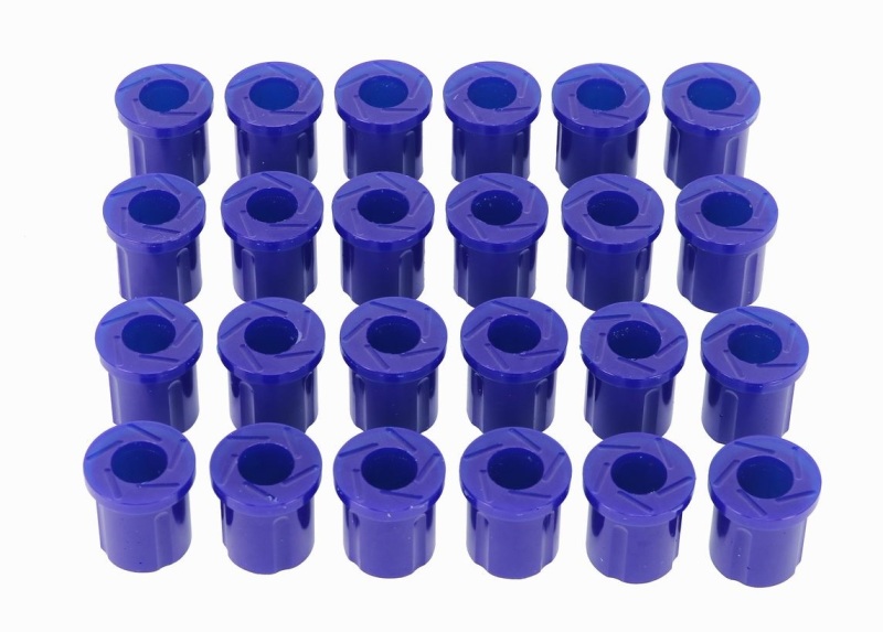 These bushings are often overlooked when upgrading the suspension of a 4WD. Leaf spring bushings stabilize the movement of the rear axle. Inferior, worn or damaged bushings in this area will cause the solid rear axle to move and impart rear end passive steer to the vehicle. It also causes the vehicle to "wander" all over the road and be unstable under heavy braking. This can be especially noticeable carrying a load or towing a boat, RV or any significant trailer. The OE rubber bushings are designed to work at standard ride height with standard wheels and tires and with standard loads. By fitting SuperPro Bushings the rear end of your 4WD will handle just about anything you can throw at it!