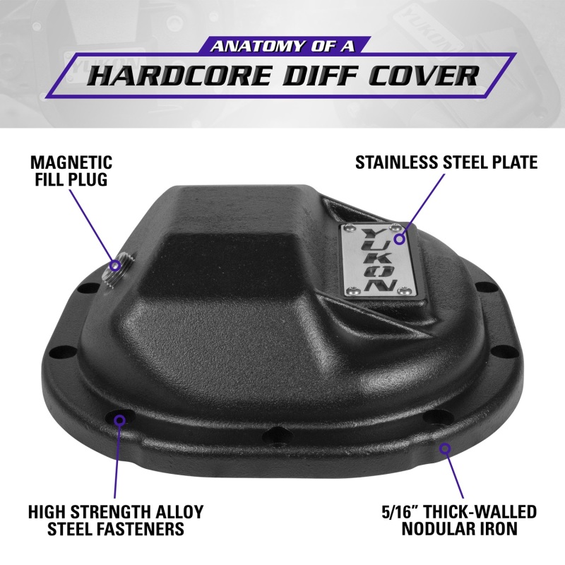Yukon Hardcore Diff Covers are constructed from thick-walled, high-strength nodular steel to protect lockers, gears and axles from the most extreme hits in off road driving. They also increase the structural rigidity of the differential, reducing deflection under high-torque situations that can put severe loads on vital internal parts. Yukon Hardcore Diff Covers feature a durable powder coat finish and high strength steel fasteners for easy bolt-on installation. It’s no secret that the underside of your rig can take a beating. Remember your diff! It’s the lowest hanging fruit and very susceptible to damage… crack or break it and you’re done for the day. Upgrade to a Yukon Hardcore Diff Cover and enjoy more peace of mind on the trail.